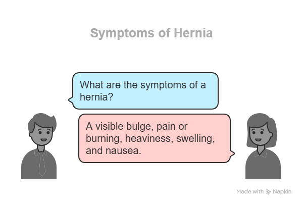 Early detection makes treatment safer and simpler. Hernias may develop silently at first but become symptomatic as pressure increases.